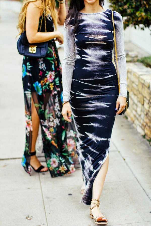 If you are going for a more sexy approach we suggest a fitted option that accentuates your curves like Cas chose. The placement of the tie-dye, along with the deep V back is flattering and elegant. To dress it down she paired it with a strappy studded sandals creating a look that can easily be worn from day to night. Ken's sheer Hawaiian printed dress reads more formal off the bat. Paired with a simple heel since the print is more than enough to make a statement, this is the perfect classic look for wedding season, especially in the summer. The black print makes it feel more chic, yet the flirty florals keep this look fun. Some of our favorite brands who make some seriously swoon-worthy maxi dresses are Nightcap and For Love & Lemons.